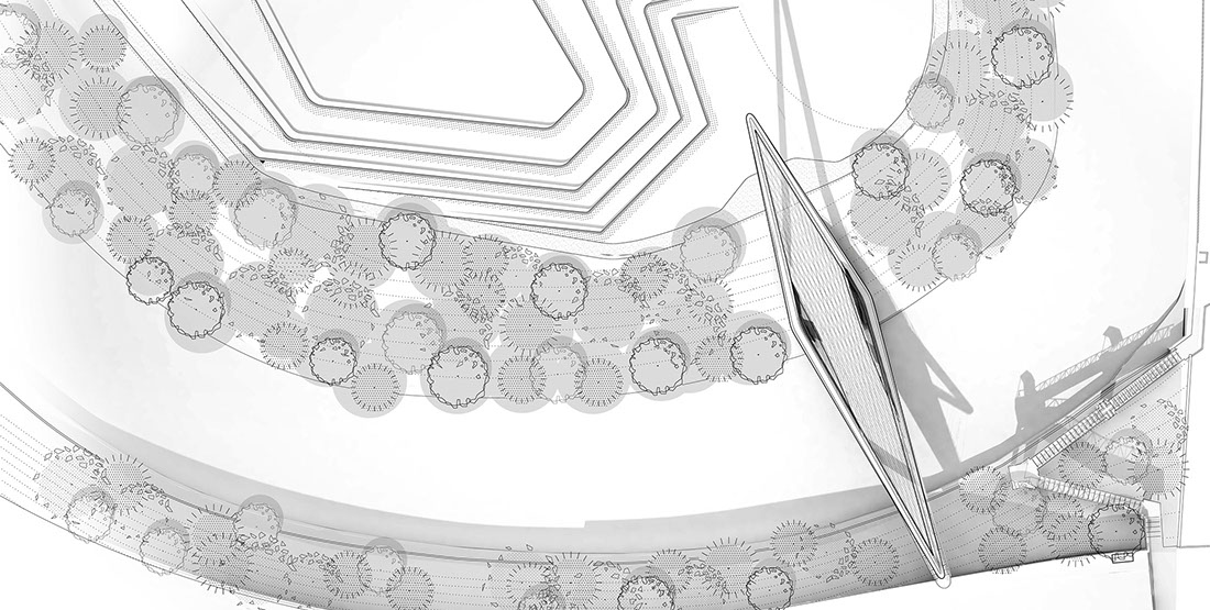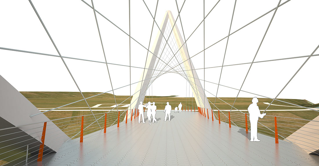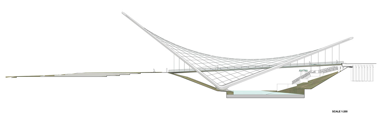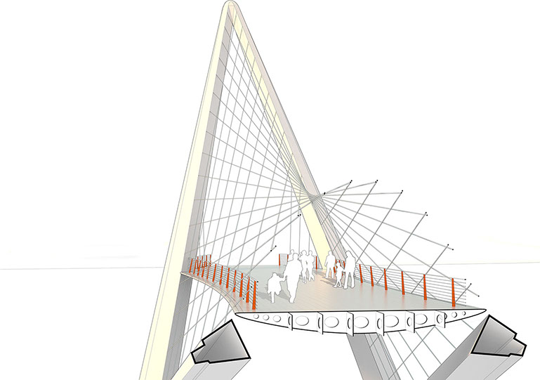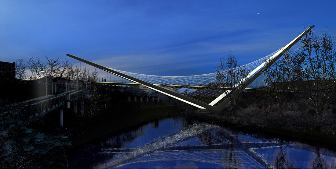 Superfusionlab designed the bridge to be a spatial structure. The cables connecting the uprights create an outdoor room over the deck of the pedestrian bridge. At night the same cables become lines of light which would create a web of light.