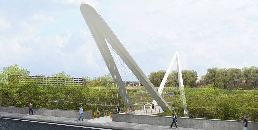 The jury report referred to our design: 'Elegant, dramatic asymmetrical unified form creates a ‘space’ with uprights and cables. One of the most dramatic schemes. Lovely piece of engineering.'