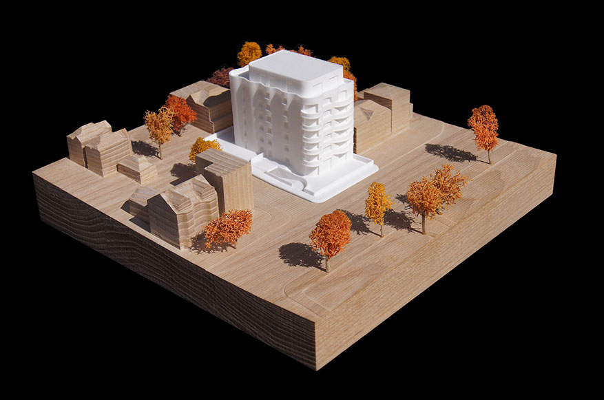 The corner is rounded to follow the geometry and indicates the prominence of the position of the building in the city block. All 12 flats benefit from balconies and view over the park.