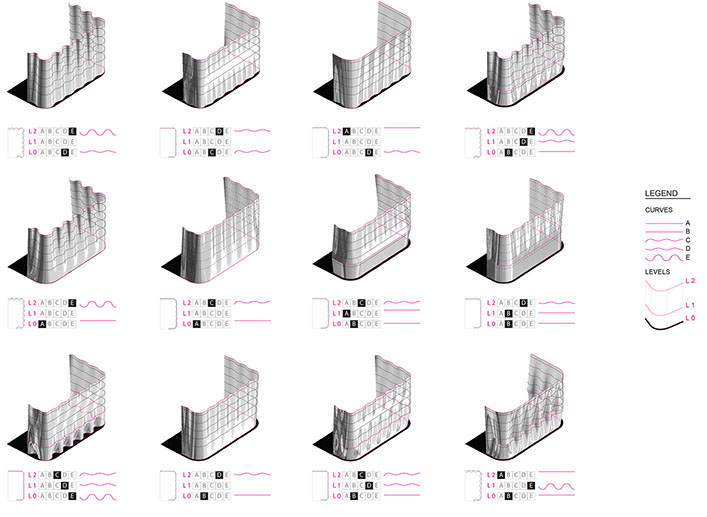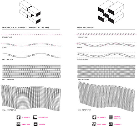 The bricks follow a new alignment, rotated 60 degrees to the line of the facade. This realignment of the brick produces an elegant rough texture along the straight line. When the facade begins to wave with larger amplitude the alignment of the brick creates a variation in the texture across the surface of the facade. In this way, as one would walk past the building the facade changes dramatically depending on the angle.
