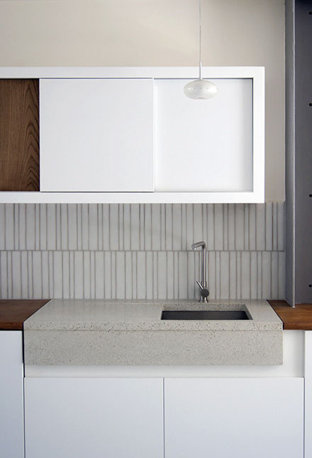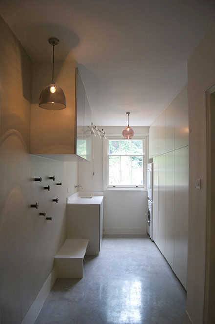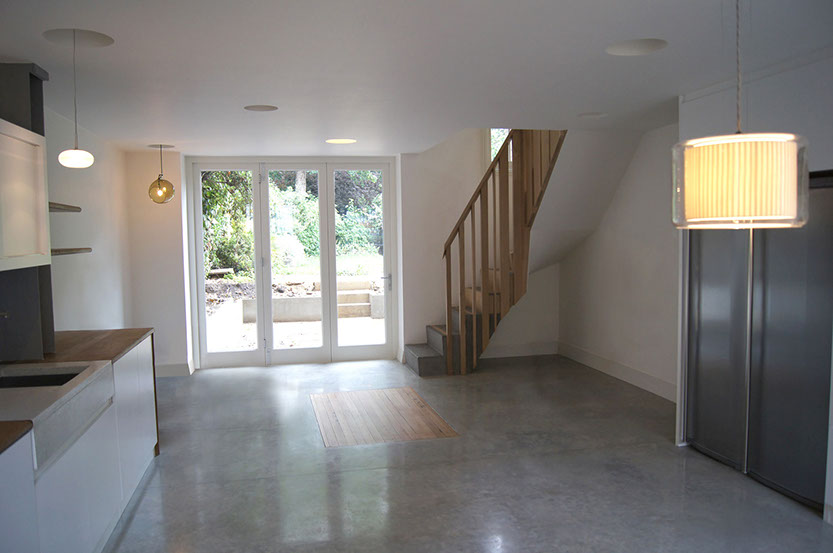 An open plan is created for the lower ground floor kitchen, dining and living area opening onto the rear garden; a sunken patio connects the indoors to outdoors. The timber from the existing wood floors and stair, from the upper floors, is brought down into the lower ground level before it is slowly transitioned into a polished concrete floor. The two materials have a transient play throughout the house, the staircase and in the new kitchen.