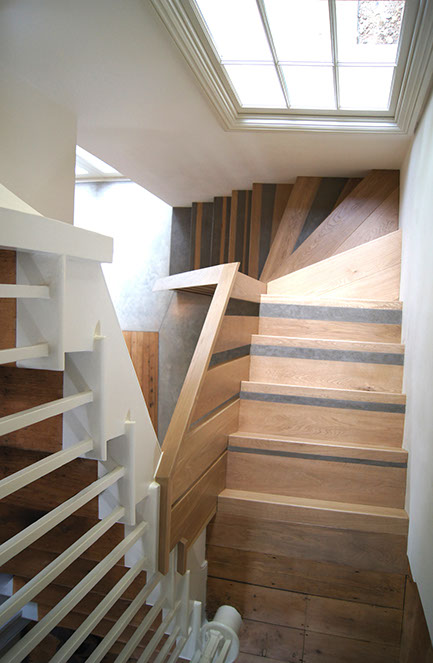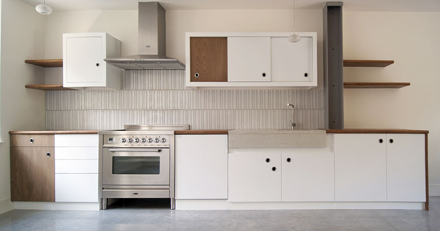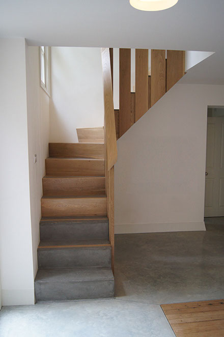 The material transitions were carefully thought through; polished concrete and untreated wood, lacquered kitchen doors and reclaimed church pews -used as a countertop.