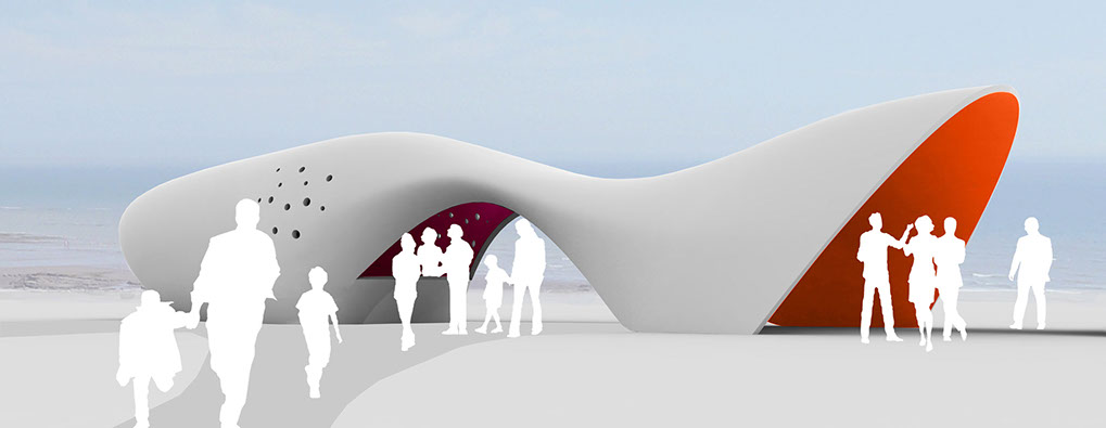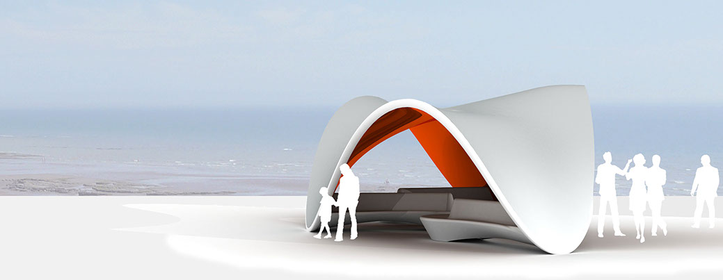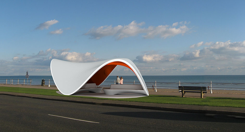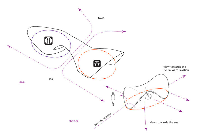 A single undulating curve creates the protective areas of the shelter and kiosk. While seated within the shelter, the view to the sea is unobstructed, as is the view along the promenade from the kiosk and toward the De La Warr Pavilion.